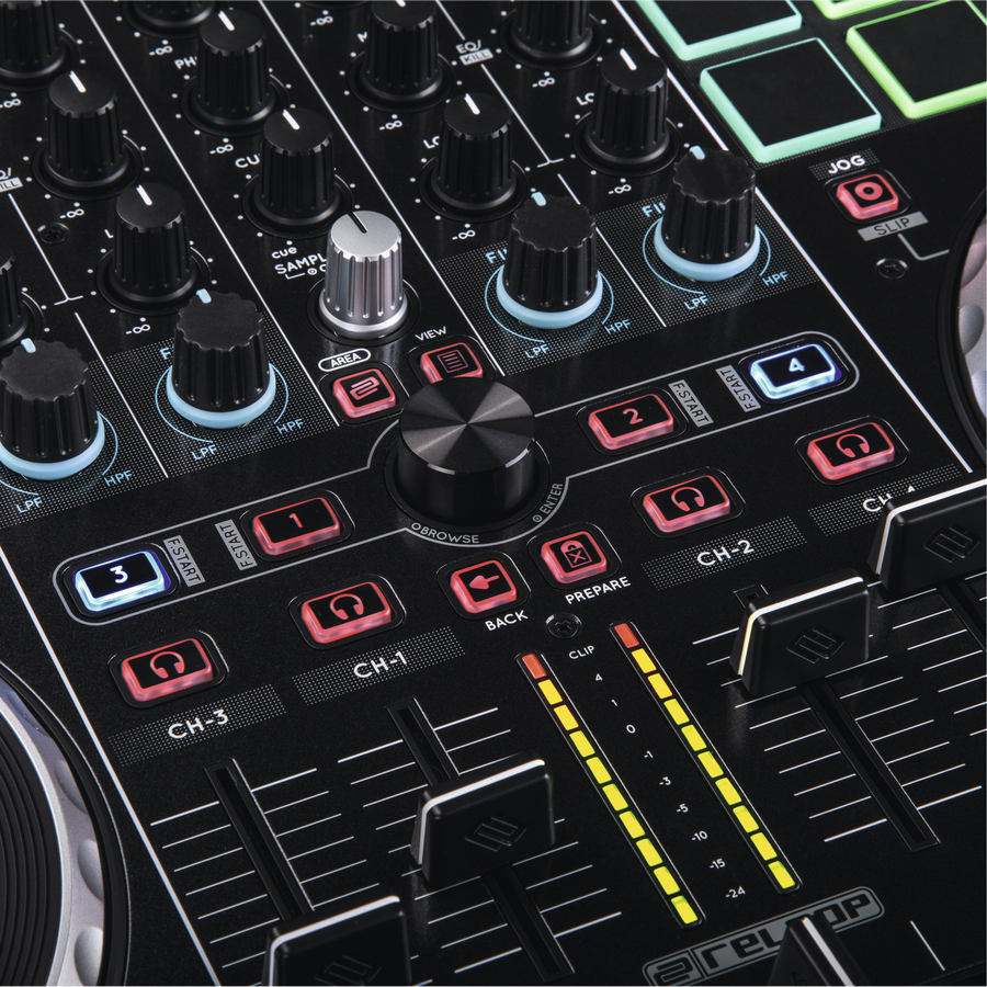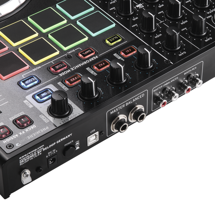 - Изход: 2x мастър изхода (1 х стерео RCA, 1x 6.3 mm жак), 1x booth изход (стерео RCA), 2x headphones monitor out (3.5 mm и 6.3 mm жак), USB тип B