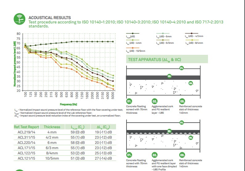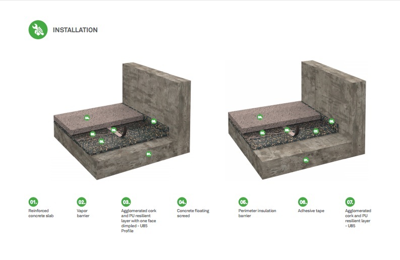 Описание: Агломериран корк и рециклиран полиуретанов слой за намаляване на ударния шум. Подходящ за шумоизолация при плаващи подове както и за топлоизолация.
