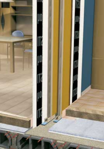 Специална преградна стена формирана от четири панела гипсокартон от 13мм и вискоеластична мембрана с висока плътност ViscoLAM 65 (4мм) 6,5кг/м² ² между слоевете, закрепени от всяка страна с двойна структура от профили от неръждаема стомана 48мм широчина, с вертикални профили ( 600мм разстояние по между им) и хоризонтални (обкрайчващи профили).