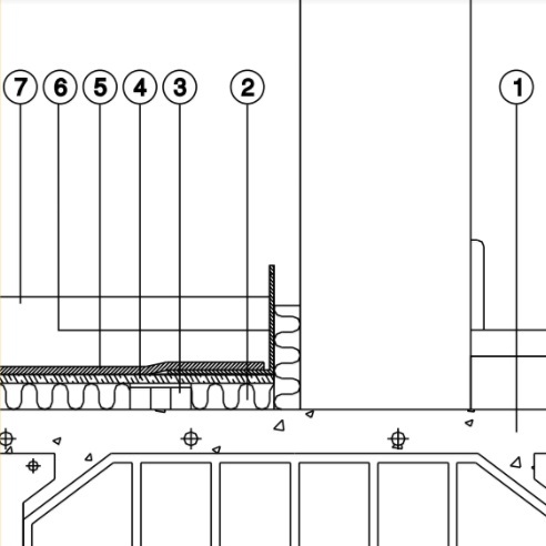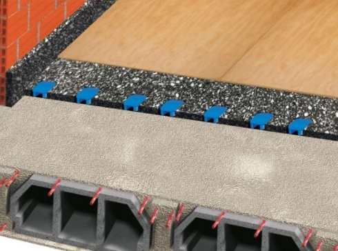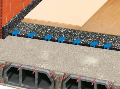 Слой от PANEL MULTIAISLANTE от агломерирана полиуретанова пяна с висока плътност и 30мм дебелина, каучукови демпфери TS80, адекватни за оптималното натоварване, водоустойчиви дървени плоскости 10мм, листи ChovA IMPACT PLUS 9мм (листи трислоен полиетилен) и армирана замазка в адекватната дебелина според натоварването.