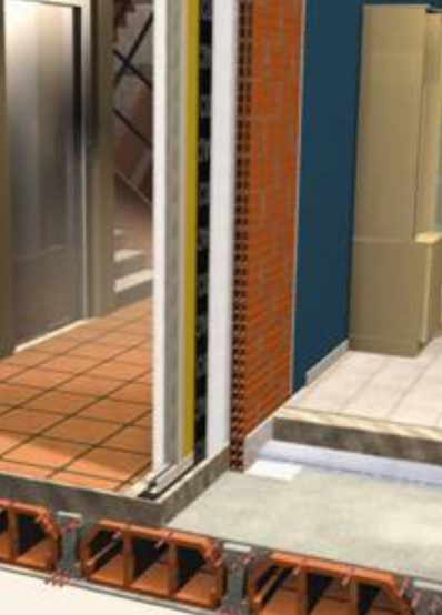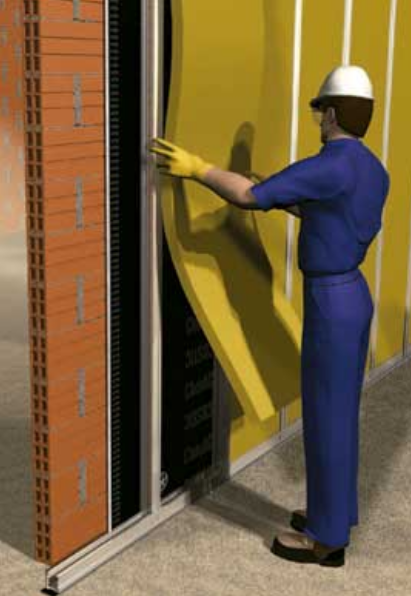 4. Монтира се металната структура на преградната стена на 2см разстояние от материала ChovACUSTIC 65 FIELTEX, според инструкциите за монтаж на гипсокартонa. Разстоянието между крепежните елементи трябва да е 600мм и се поставя самозалепваща лента за структурна изолация ELASTOBAND 50 под всеки един от каналите. За стените, които трябва да бъдат опорни трябва да се използват предстенен окачвач 3801/TD1.