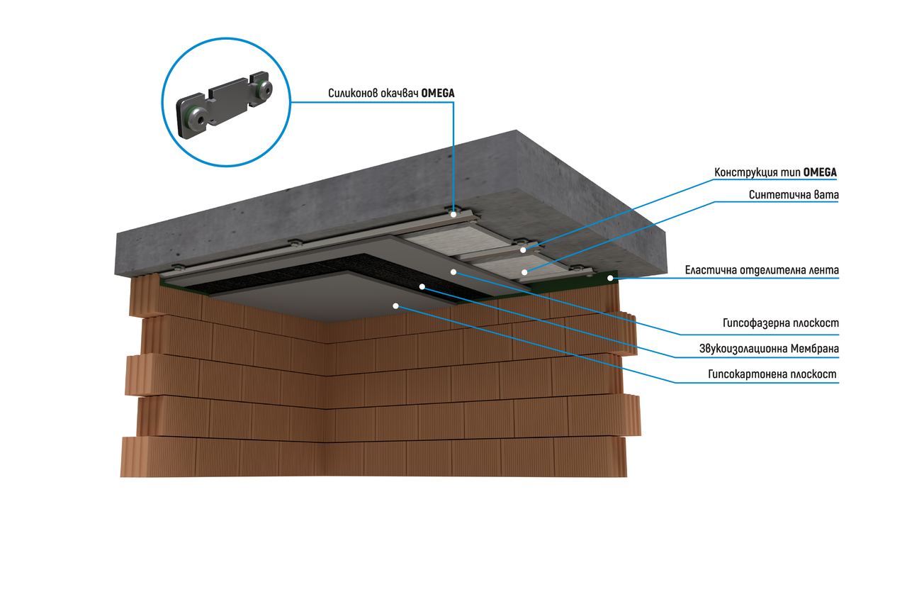 Описание:Строго специализирана за удовлетворяване на нуждите на пазара за шумоизолация за таван на минимална дебелина система OMEGA UP е разработена от комбинация от висок клас силиконови вибро окачвачи на испанската компания Senor с еластична високоякостна метална конструкция разработена за акустични цели. Използването на синтетична вата за акустичен материал дава не само по-добри акустични характеристики, но и изпълнява нормите за екологично чист продукт.Гипсофазерната плоскост в комбинация с шумоизолационната мембрана осигуряват необходимото тегло за намаляване на преминаването на звуковите вълни между помещенията. Завършващата гипсокартонена плоскост е избрана, за да бъде лесно обработена и подготвена за боя.