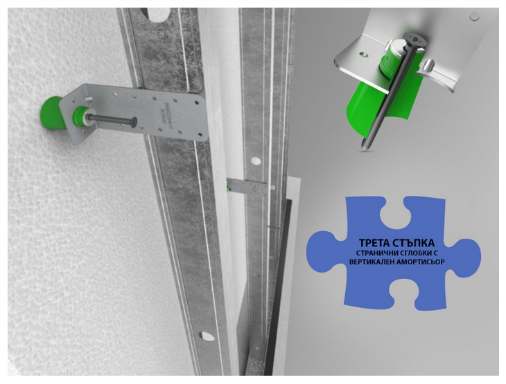 Описание: Това е перфектната шумоизолационна система против въздушен и ударен шум със намаляне на звуковия индекс от 60 до 65dB. Използва се когато има достатъчно въздушно разтояние от стената до първия слой на гипсокартон. Минималната дистанция е 10-12см. Системата включва.