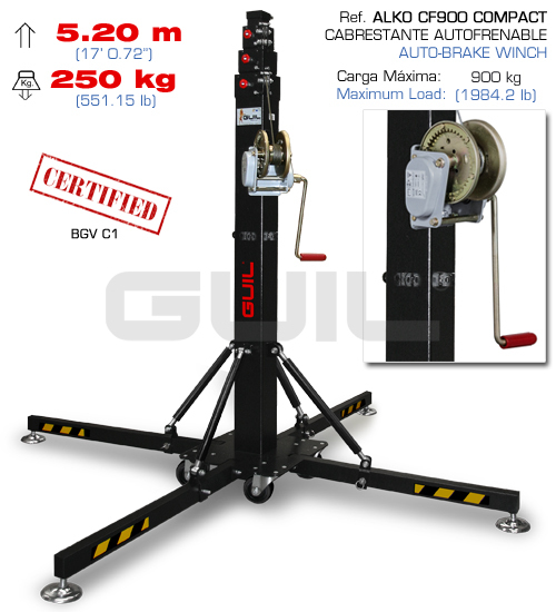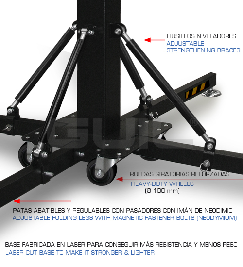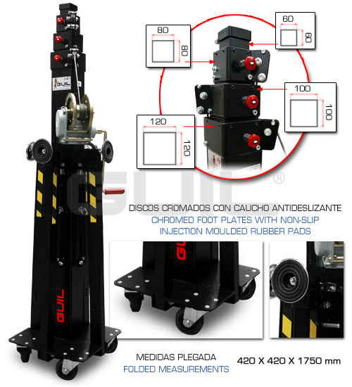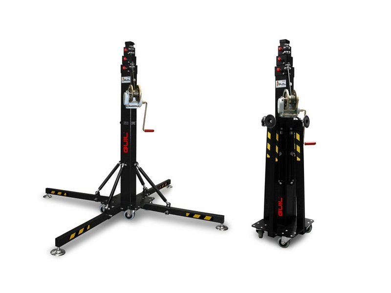 Този сценичен повдигач се състои от четири телескопични секции, изработени от здрава стомана (S235 JRH, DIN EN 10219-1: 2006), всяка секция има заварен армиран край за максимална здравина и е завършена в текстурирано, черно, устойчиво на надраскване прахово покритие (епоксидно), за да се предпази лифта от излагане на влага. Тази особеност го прави подходящ за използване на открито, гарантиращ максимална устойчивост на корозия. Здравите секции се удължават чрез стоманено въже с Ø 5 мм (0,24 ") с независима поцинкована стоманена сърцевина, специално изработено за повдигане на тежки товари (съпротивление: 2150 кг (DIN 3969), което се ръководи от самостоятелно смазващи ролки с лагери.