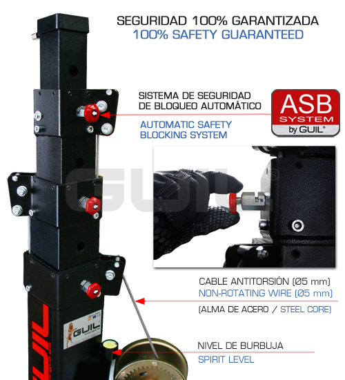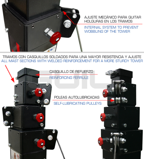 Секциите на мачтата са блокирани посредством предпазни болтове; тези предпазни болтове са основен елемент, докато използвате този асансьор, за да блокирате и деблокирате секциите на подемната рама в желаната височина. Всички ремъчни шайби и водачът на ролковия кабел имат защитни метални пластини, които имат две основни функции: