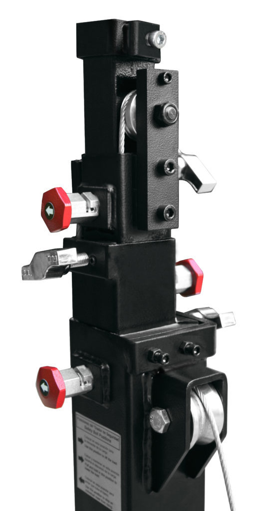 Система за безопасност Zip / Trigger с болтове за безопасност. В крайния случай на счупване на кабела, предпазният болт веднага би блокирал мачтата, спирайки натоварването от падане.