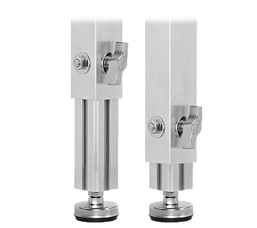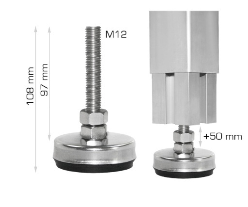 По-фино регулиране на височината се извършва с помощта на регулируем нивелир от неръждаема стомана M12.