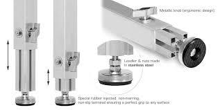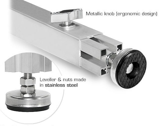 Телескопичната му система позволява различни височини само с един комплект крака (регулируем милиметър по милиметър) и осигурява перфектно изравнен етап при настройване върху неравномерни повърхности (рампи, стълби, външен терен и др.)