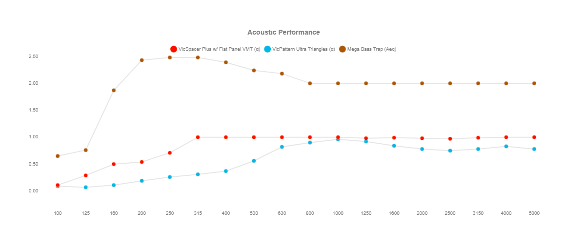 Размери: VicSpacer Plus с плосък панел VMT: 599 × 1194 × 66 mm / 23,6’’ × 47,0’’ × 2,6’’; Триъгълници VicPattern Ultra: 595 × 595 × 50 mm / 23,4’’ × 23,4’’ × 1,97’’; VicFix J профил: 10 × 20 × 1190 mm / 0,39’’ × 0,79’’ × 46,9’’; Mega Bass Trap: 680 × 384 × 1788 mm / 26,8” × 15,1” × 70,4’’