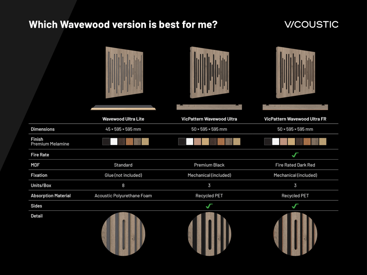 Описание: Панелът VicPattern Ultra Wavewood е едно от водещите решения, които Vicoustic предлага по отношение на системата за контрол на абсорбцията и отразяването*. Това е идеално за тези, които се стремят към балансиран звук, който може едновременно да контролира всякаква шумова енергия в стаята и въпреки това да управлява и създава жив и ярък звук в определена обстановка. Изработен от меламин, изключително издръжлив материал, панелът VicPattern Ultra Wavewood се предлага в 8 различни цвята на дърво и метал. Наред с това, VicPattern Ultra Wavewood също използва специално проектирана PET вълна, устойчив материал, който увеличава максимално акустичните абсорбиращи способности на панела и допринася за целта на Vicoustic да произвежда по-екологични и по-екологични продукти. Този продукт може да се монтира и на тавана с VicFix J Profile 2m, продава се отделно. За ъглов монтаж използвайте VicFix Corner, продаван отделно.