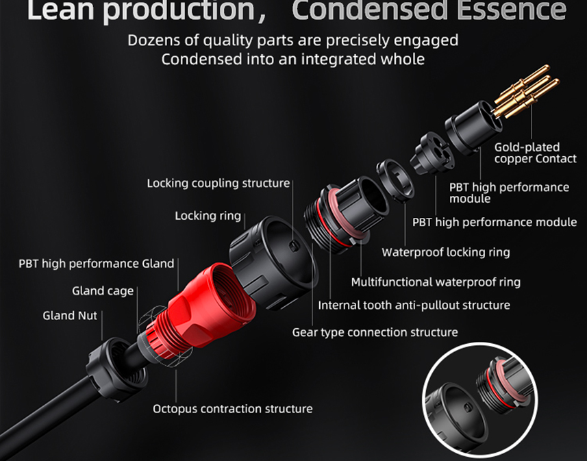 Описание: Новата серия водоустойчиви конектори YM(M20,M24) на CNLINKO използва характеристиките на полибутилен терефталат (PBT), като материал за леене под налягане и като съставна суровина за многоядрения дизайн на продукта подобряващ устойчивостта от корозия и на безопасност. Цялото тяло на конектора приема уникален пружинен тип на въртящо се заключващо съединение. Прецизната вътрешна конструкция и здрава структора осигуряват безопасна и стабилна връзка, както и трансмисионна производителност гарантираща стабилността на електрическата мощност. Тази серия конектори отговарят на нуждите на фирмите доставящи захранващо и сигнално оборудване.